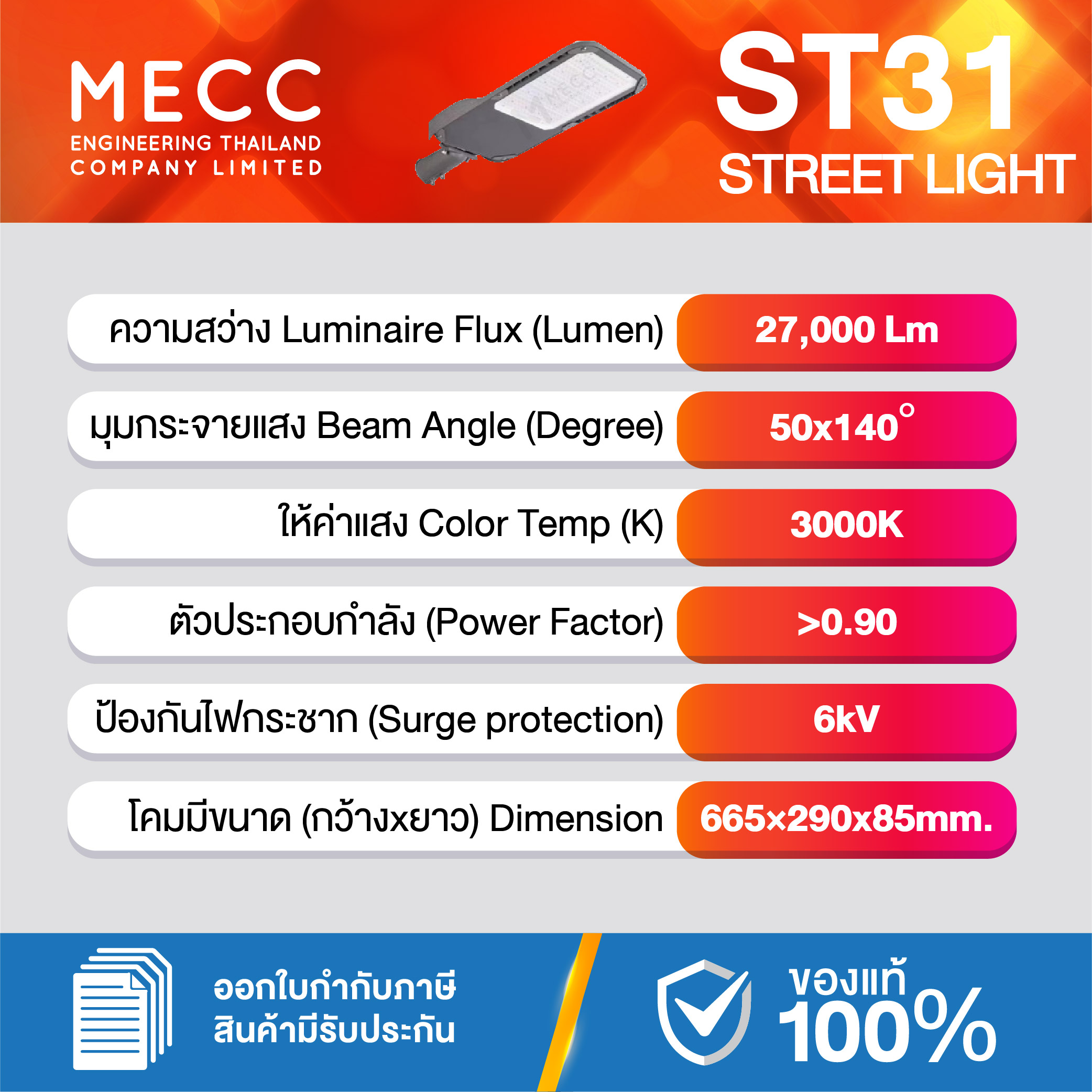 โคมถนน Streetlight LED 180W 3000K 27,000lm รุ่น ST31 แสงส้ม