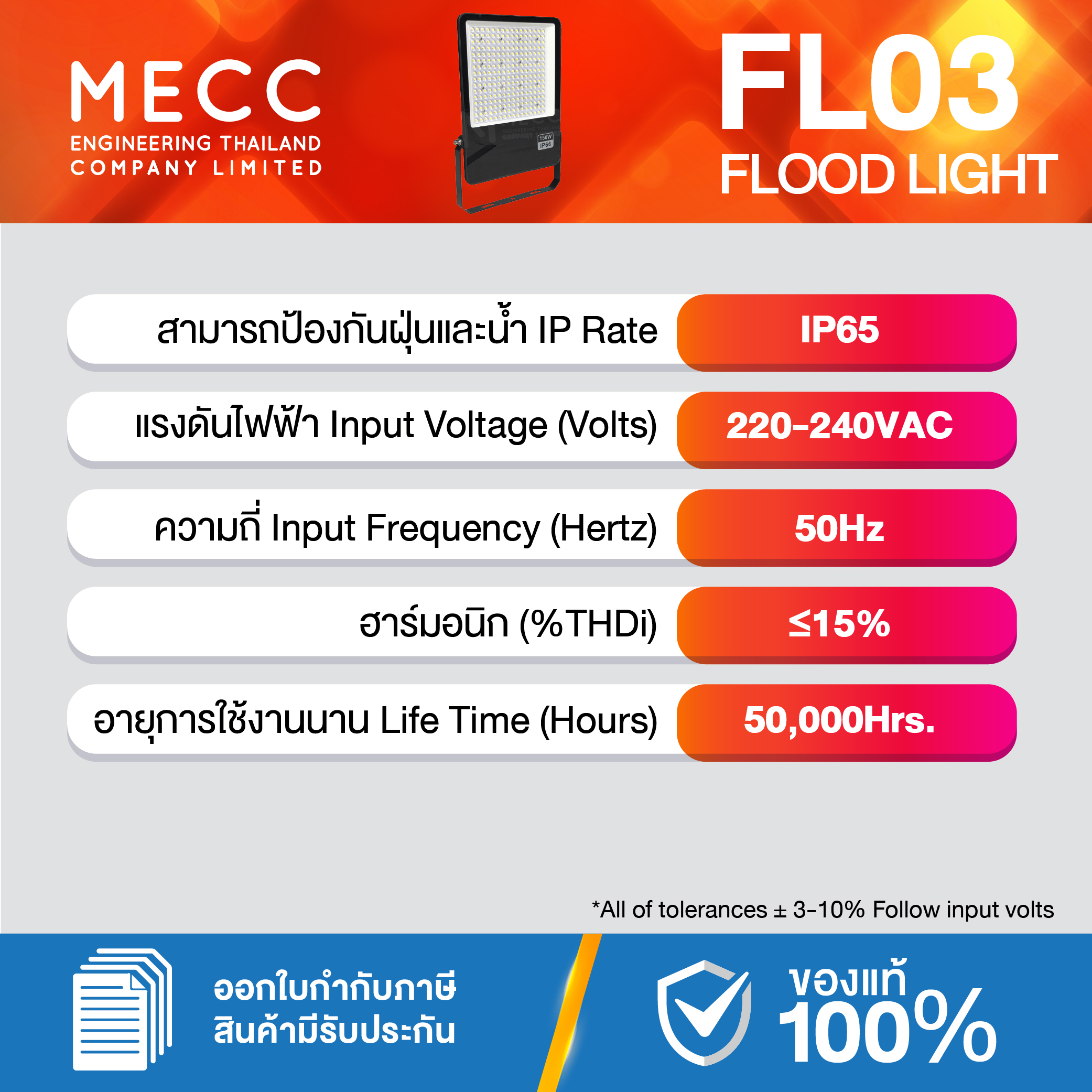 โคมฟลัดไลท์ Floodlight LED 150W 5700K 16,500lm รุ่น FL03 แสงขาว