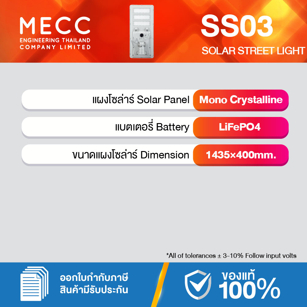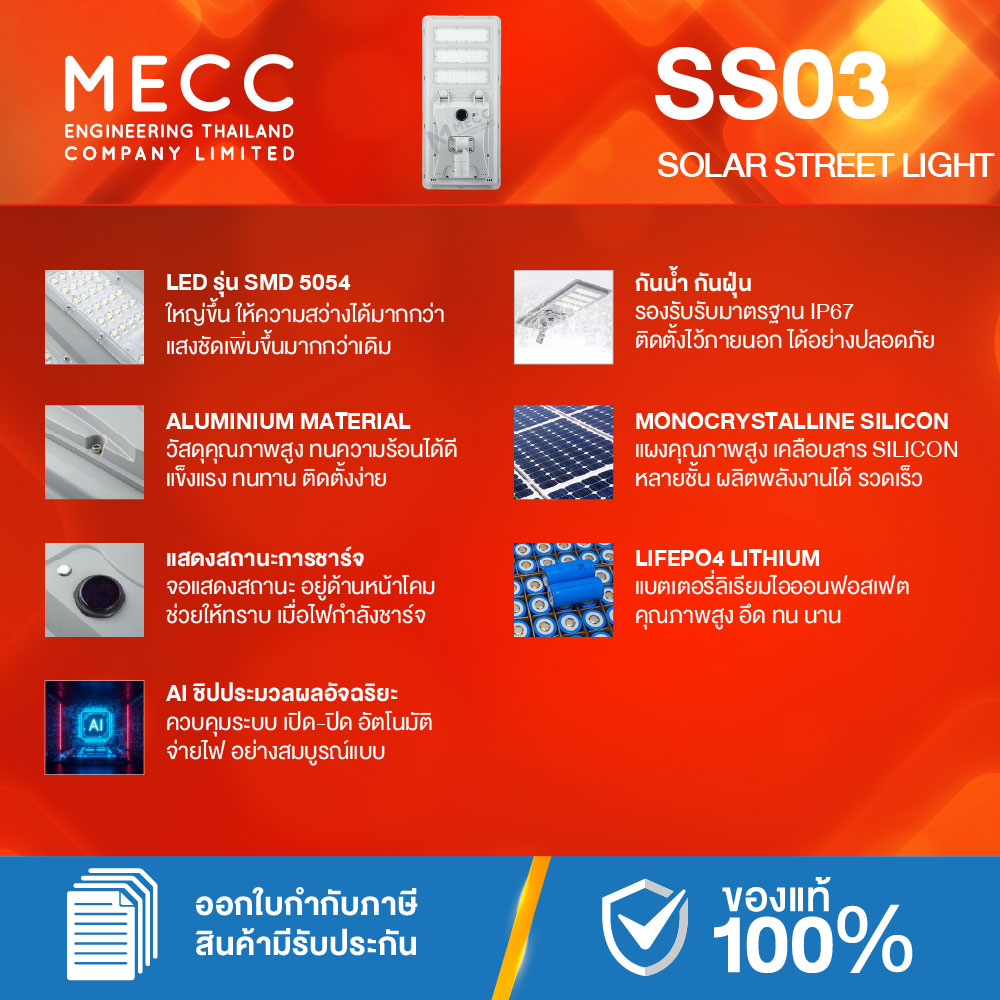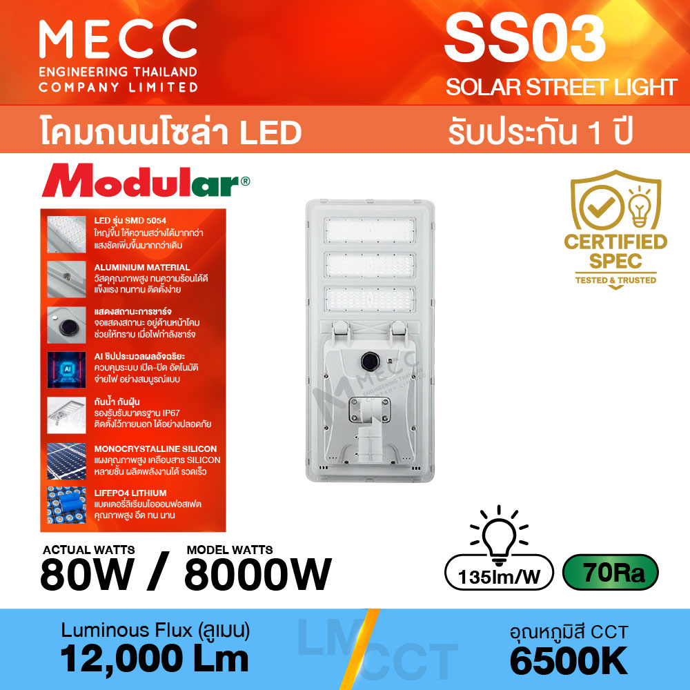 โคมไฟถนนโซล่าเซลล์ Solar Street light LED 80W 6500K 12,000lm รุ่น SS03 แสงขาว