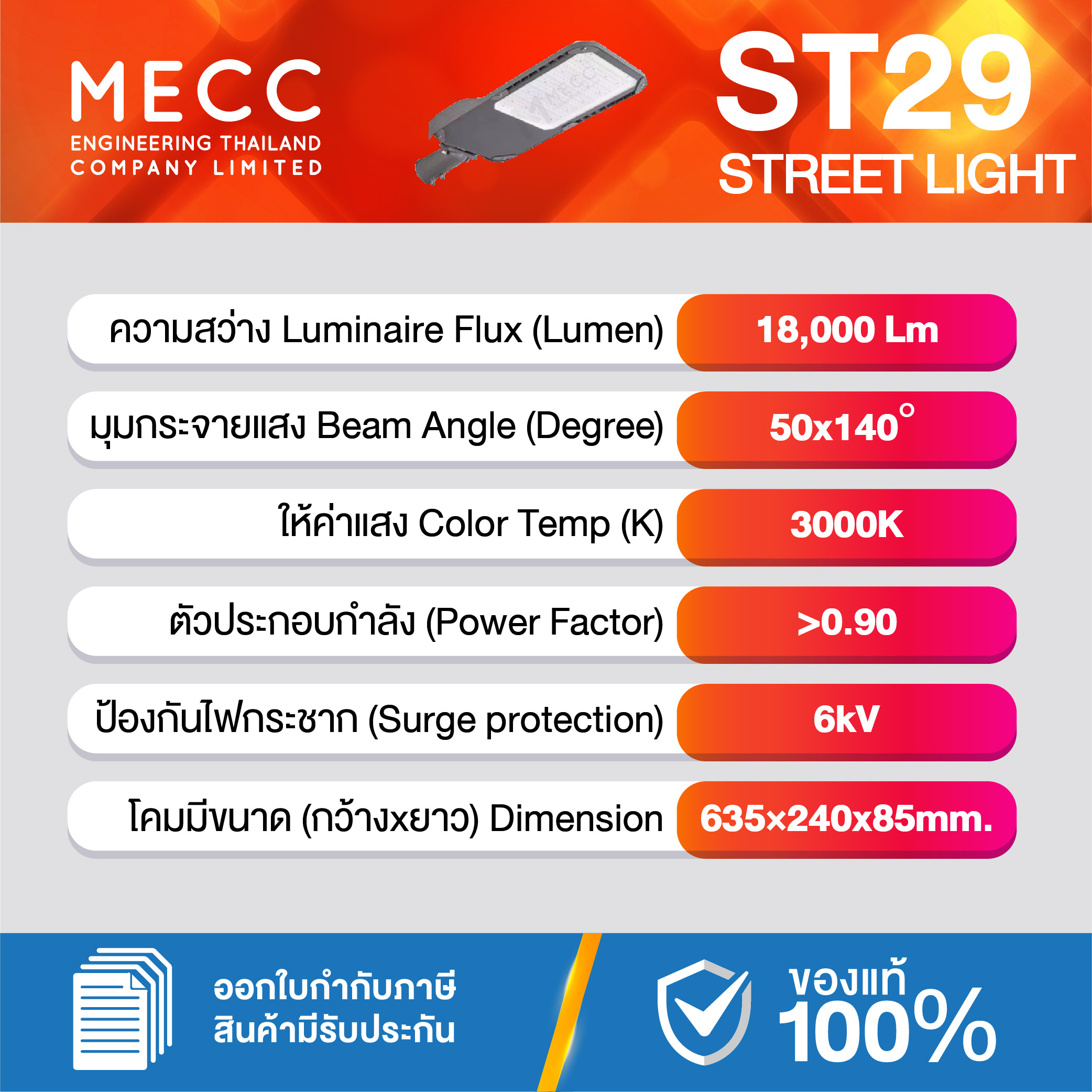โคมถนน Streetlight LED 120W 3000K 18,000lm รุ่น ST29 แสงส้ม