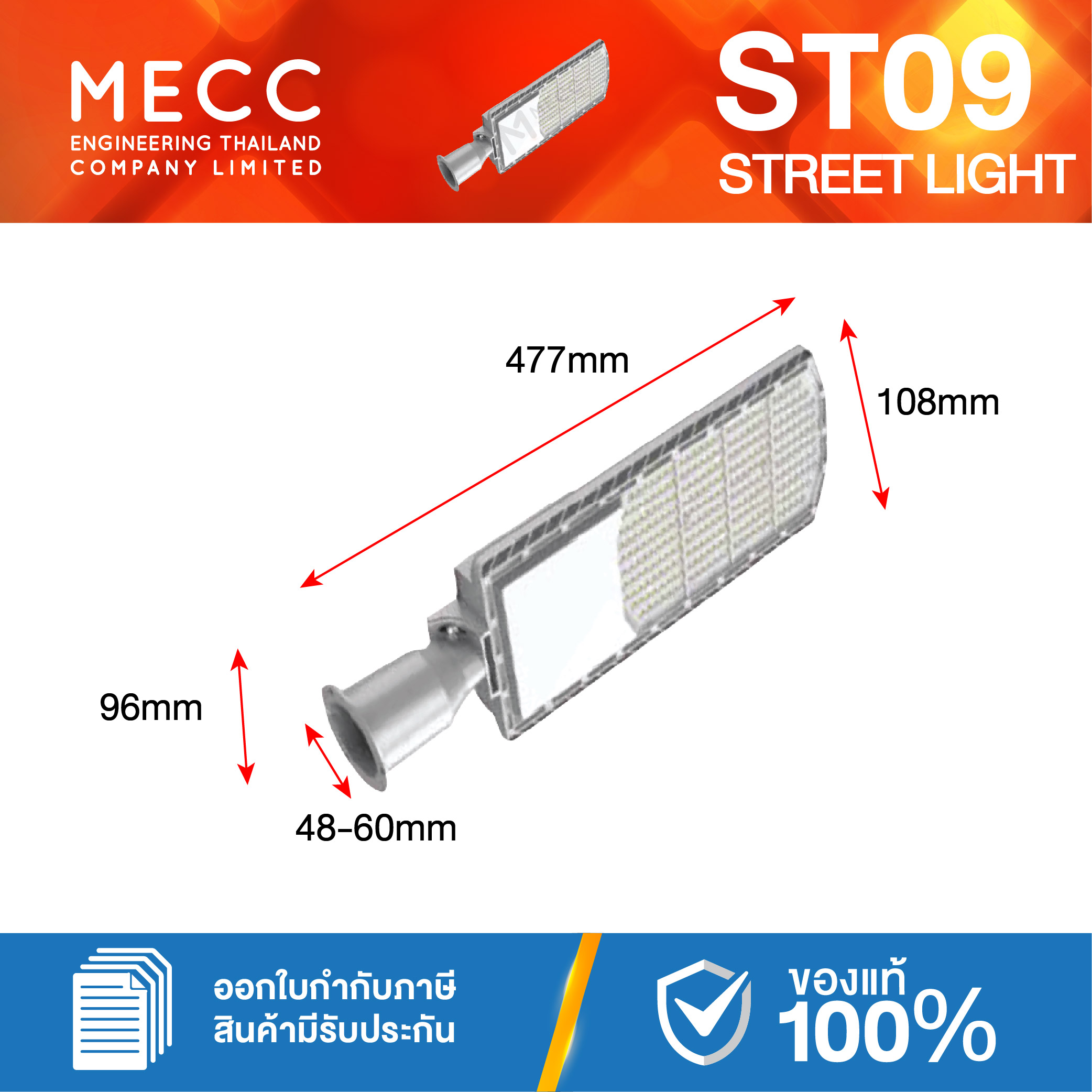 โคมถนน Streetlight LED 50W 3000K 7,000lm รุ่น ST09 แสงส้ม