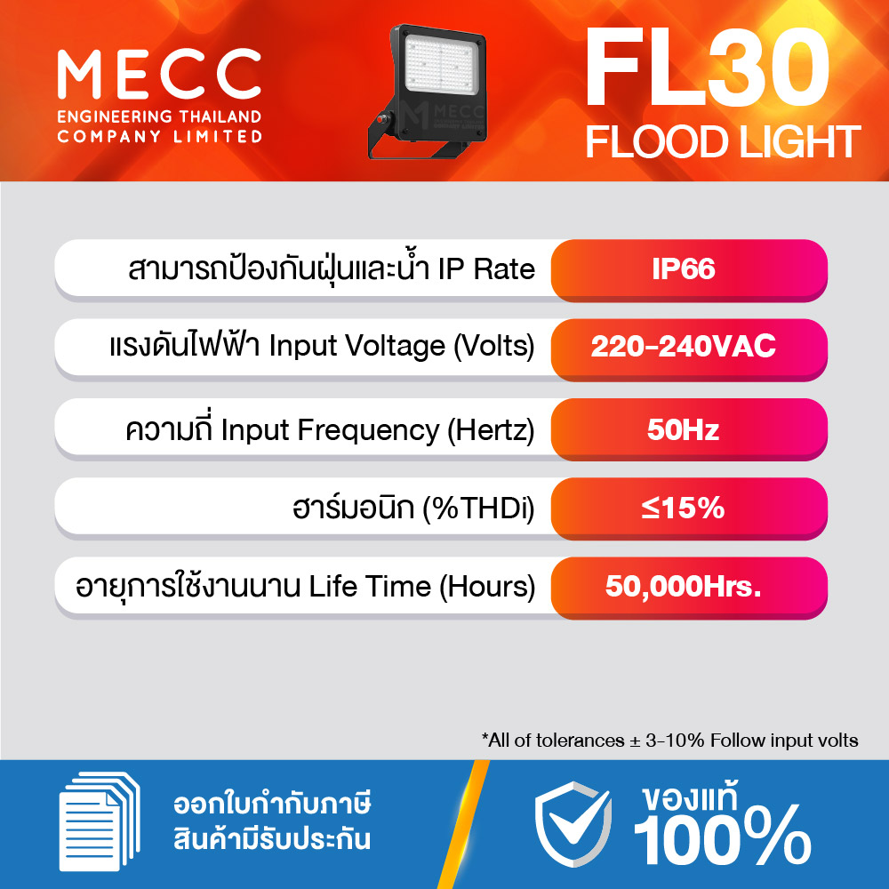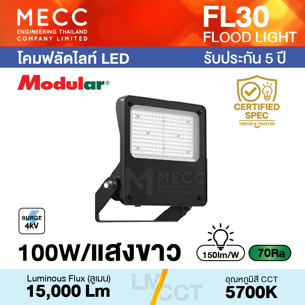 โคมฟลัดไลท์ Floodlight LED 100W 5700K 15,000lm รุ่น FL30 แสงขาว