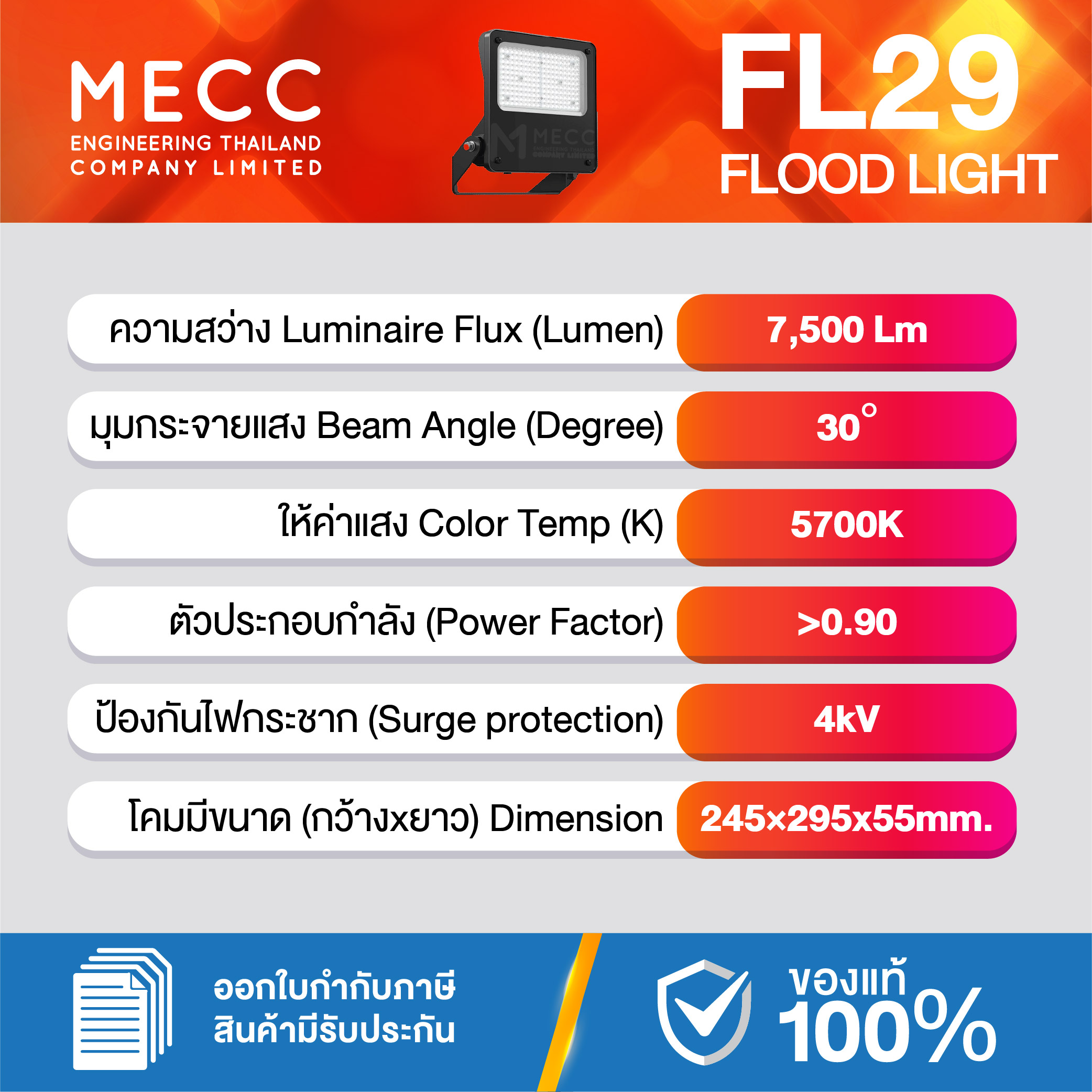 Luminous Flux : ฟลักซ์การส่องสว่าง (Lumen) : 7,500lm
