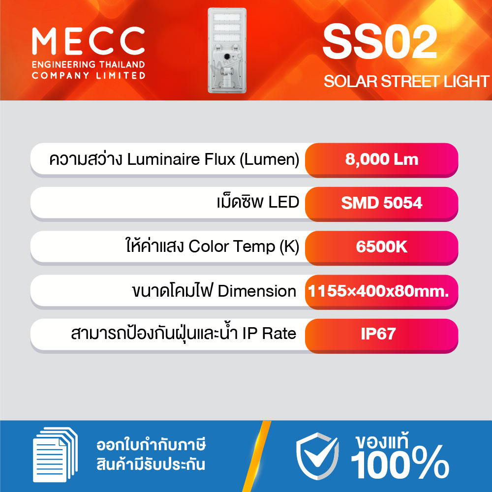 โคมไฟถนนโซล่าเซลล์ Solar Street light LED 60W 6500K 8,000lm รุ่น SS02 แสงขาว