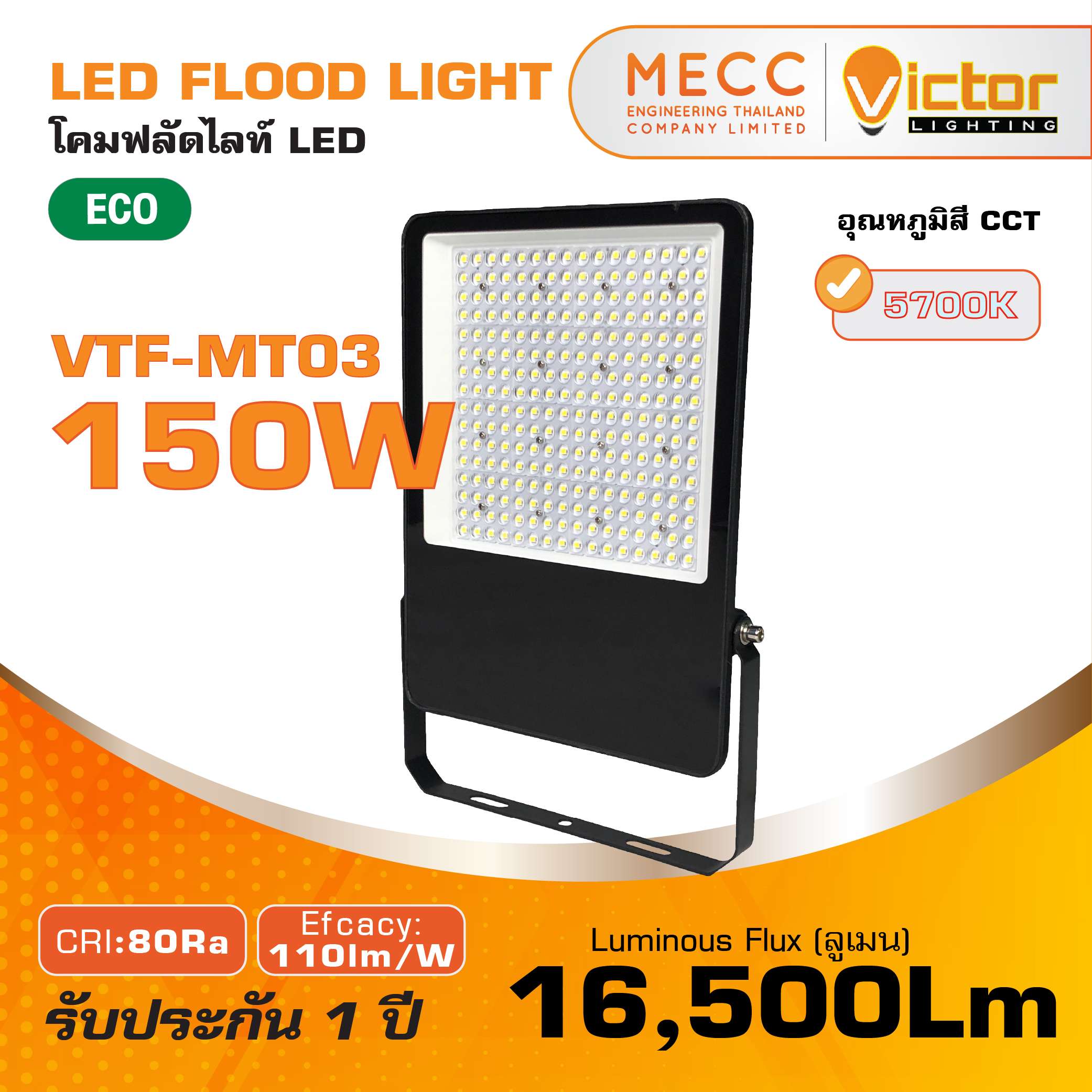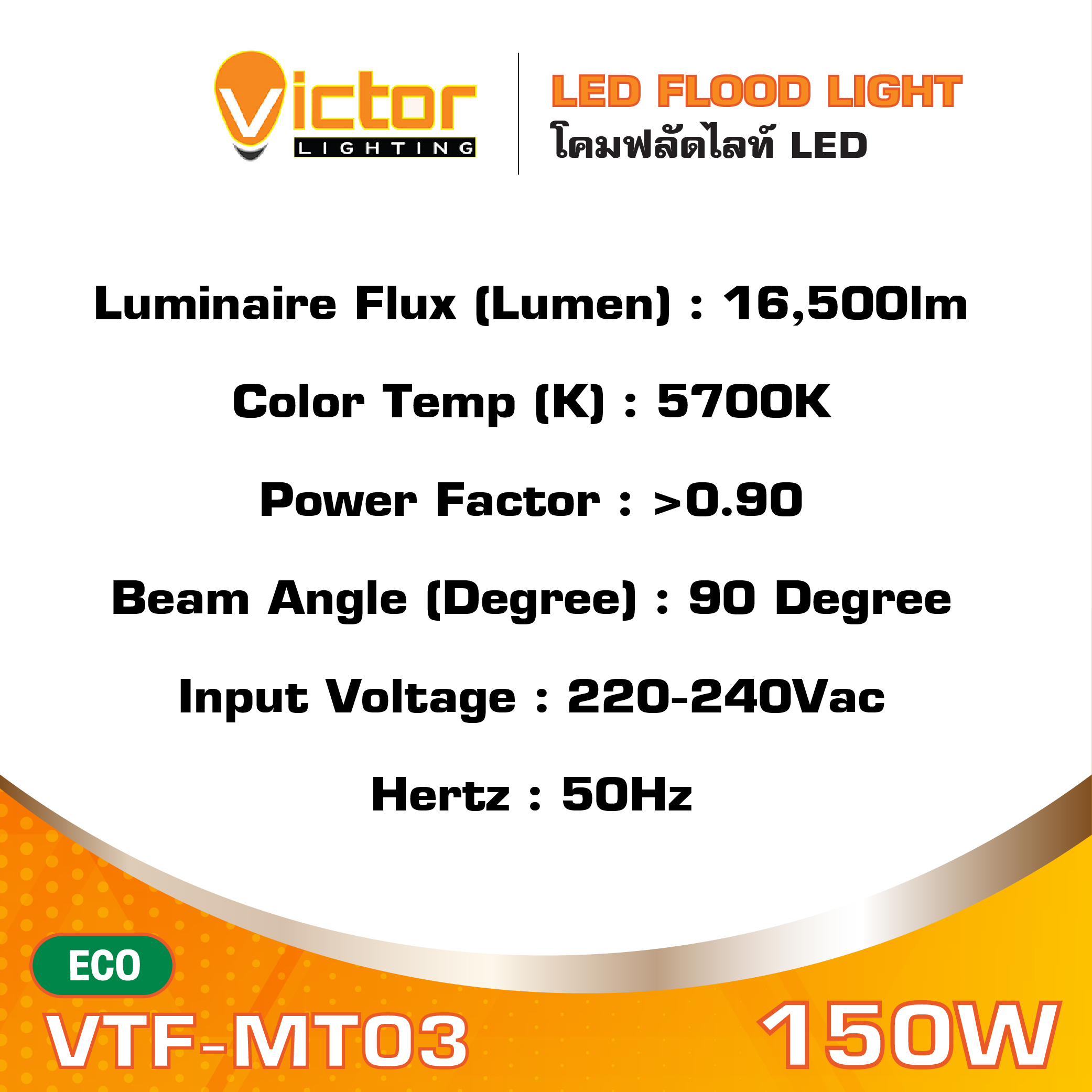 โคมฟลัดไลท์ Floodlight LED 150W 5700K 16,500lm รุ่น VTF-MT03 แสงขาว