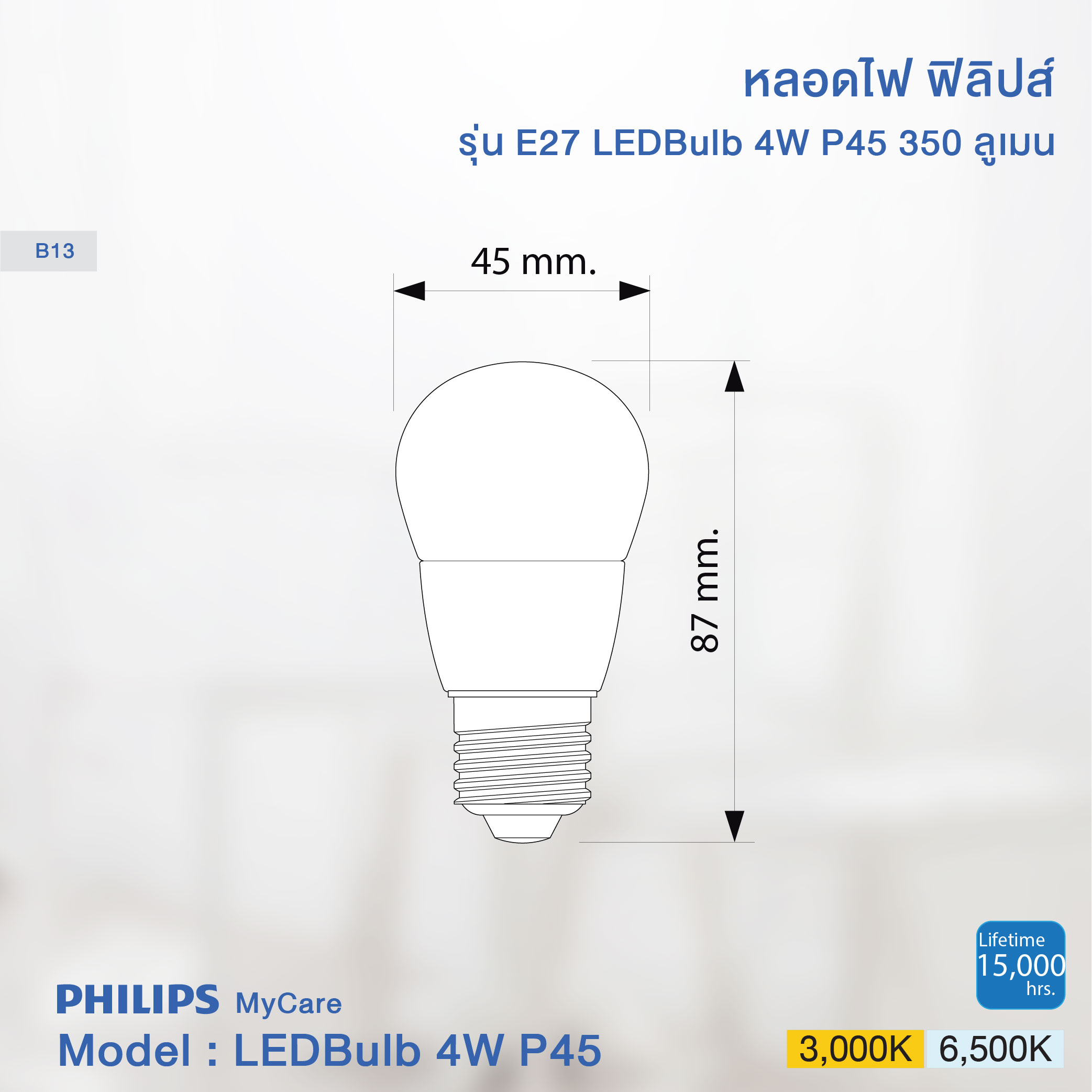 - ขนาดหลอดไฟ 45 x สูง 87 mm.