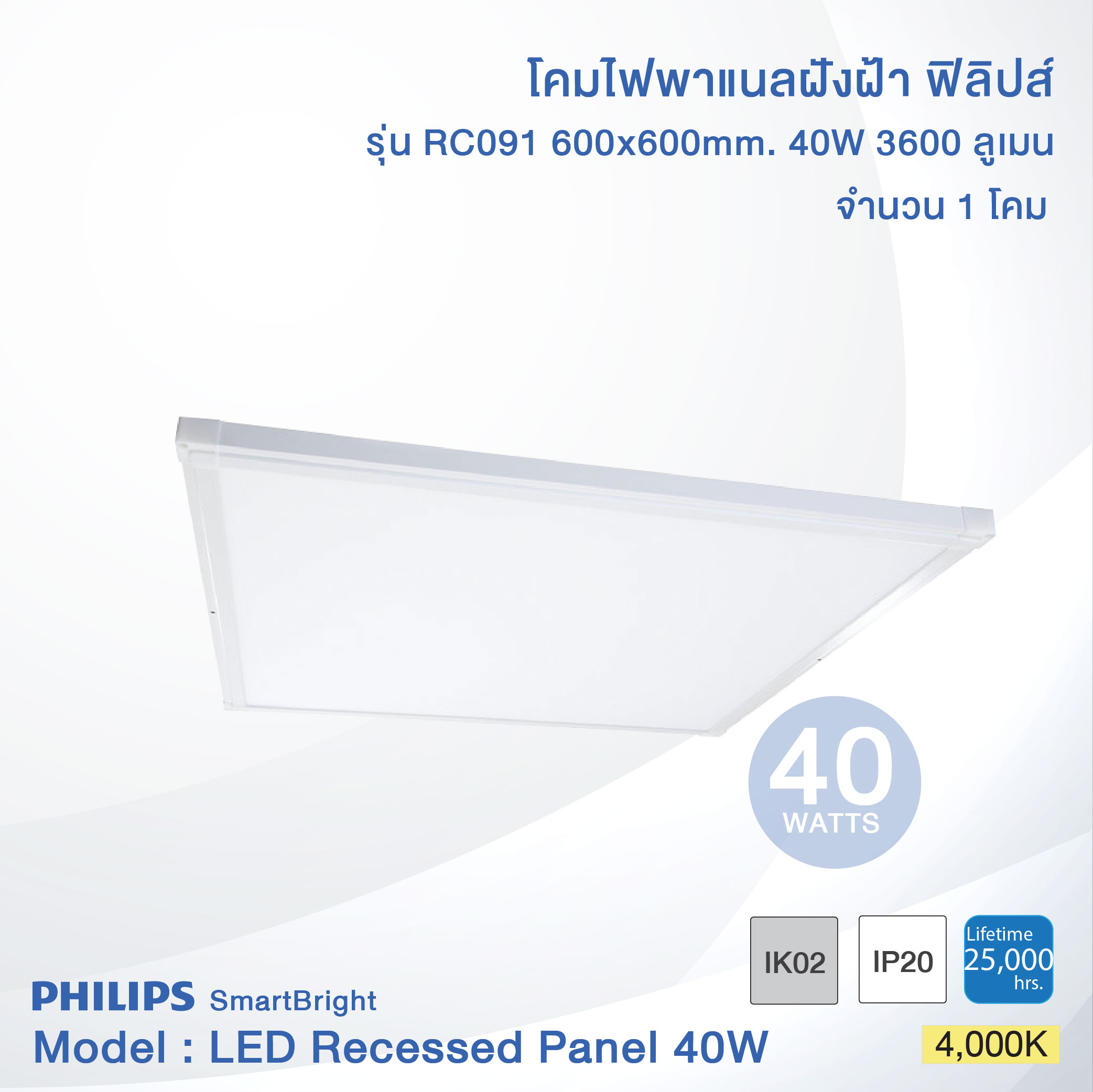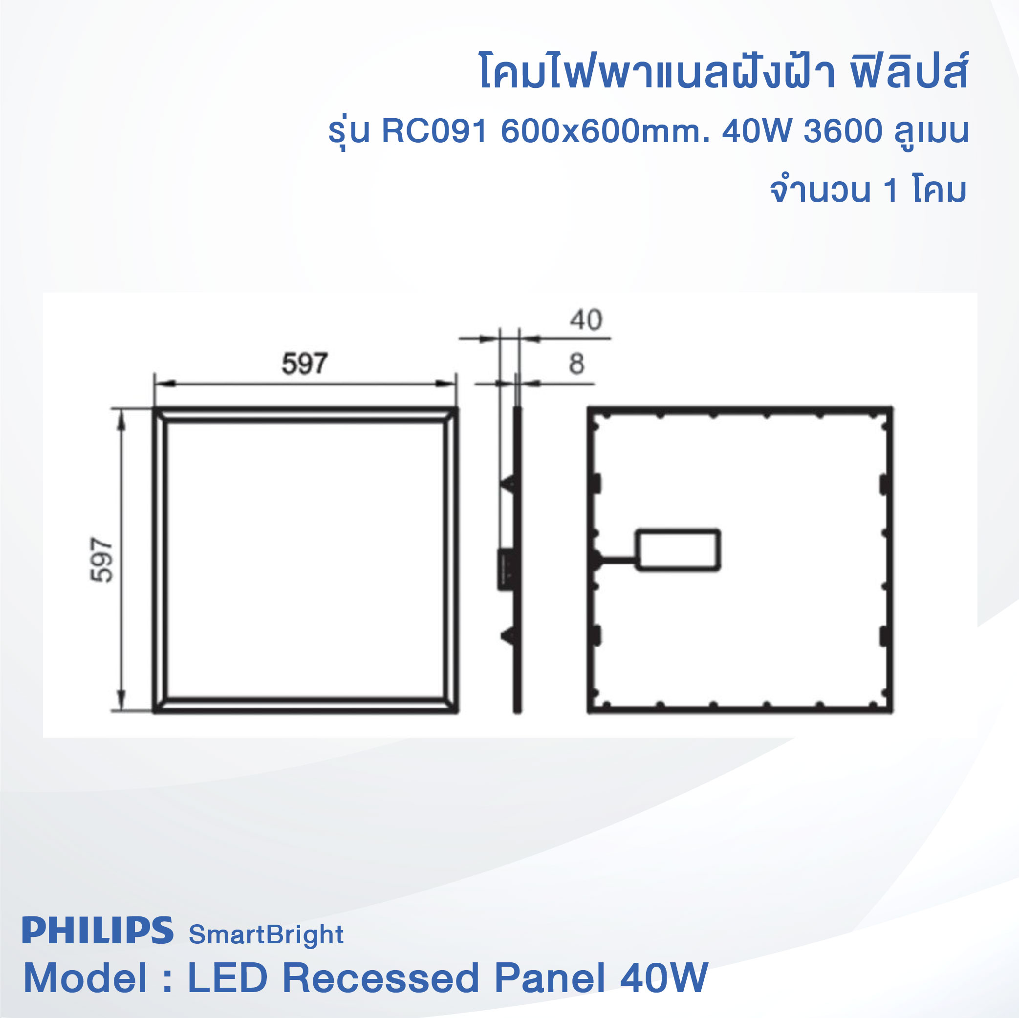 Philips SmartBright LED Slim Panel Light RC091 40W size (60×60 cm.) (ฟิลิปส์ โคมไฟฝังฝ้า สมาร์ทไบร์ท แอลอีดี สลิม พาแนล RC091 40วัตต์ ขนาด 60×60 ซม.)